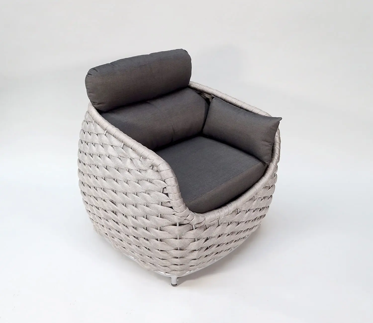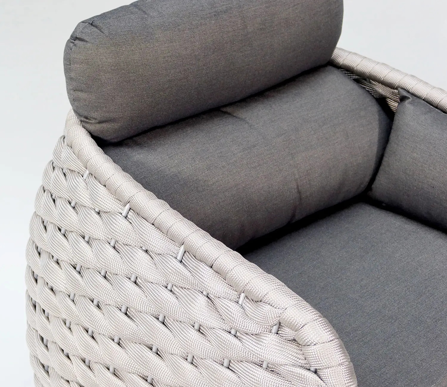 Stahlrohrgestell und strapazierfähiges Polyesterstrick. Bespannt mit horizontalen XL-Rope-Geflecht in modernster Kordeloptik. Inklusive bequemen Rückenkissen, einem kleinem Zusatzkissen und Sitzpolster. Polster mit Reißverschluss und waschbar bis 30°.