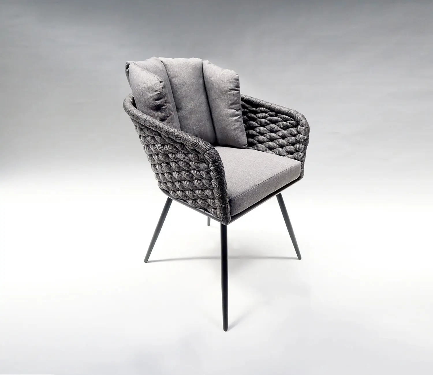 Stuhl BÜHLAU: Minimalistisches Stahlgestell mit strapazierfähigem Polyesterstrick. Sitz- und Rückenfläche ist bespannt mit horizontalen XL-Rope-Geflecht in modernster Kordeloptik. Inklusive bequemen Rückenkissen und Sitzpolster. Polster mit Reißverschluss und waschbar bis 30°.